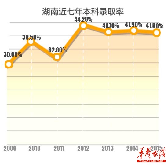 比起北京的考生,湖南41.5%的本科录取率更是相距甚远,2015年北京市高招本科录取率达71.8%,这是北京市高招本科录取率首次突破70%。