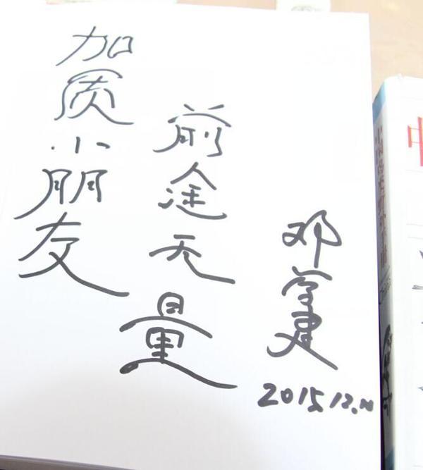 一个小时的时光悄悄溜走,邓教授请了文加质到他的住处,送她一本自己主编的《湖南动物志.鸟纲.雀形目》的精装大书。并欣然题上词:“加质小朋友,前途无量。邓学建,2015.12.12。”爱惜之情溢于言表。