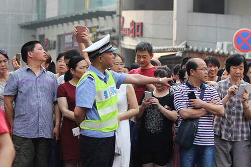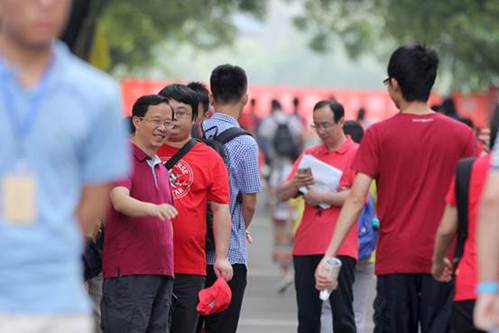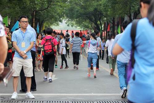 在考场外等待考生出考场的家长们。