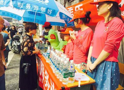 街道志愿者们为家长们准备了免费的水和祛暑药物。