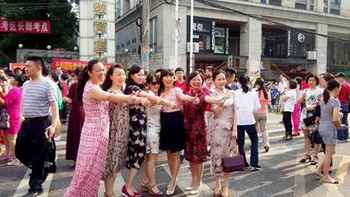 考场外旗袍妈妈们给考生加油,祝考生们旗开得胜。