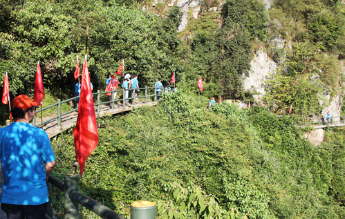 深深切开山谷的统溪河,两岸都是陡峭悬崖和茂密森林,窄窄的茶马古道在峭壁上延伸,脚下便是急流。过河只能靠铺着木板的索桥,多几个人走上去就会晃晃悠悠。在当年红军的征兵站里,悬挂着溆浦县老红军夫妇手书的“长征精神,永放光芒”匾额。回顾历史,红军在强敌重重包围和封锁之中,纪律严明,待人和气,买卖公平,取消苛捐杂税,慰问劳苦群众,保障商铺正常营业,枪毙罪大恶极的劣绅恶霸,大长了人民群众志气。红军在溆浦城乡广泛宣传党的抗日政策,发动组织群众,开展革命活动,得到广大人民群众的一致拥护,近3000名溆浦优秀儿女加入红军队伍,并有5支游击队集体加入红军。红军在逆境中不屈不挠、不畏艰险、坚持信念的斗争精神,鼓舞了“重走长征路”队伍的士气。强烈的阳光直射在道路上,气温逼近40度,大家挥汗如雨,却没有人叫苦叫累。