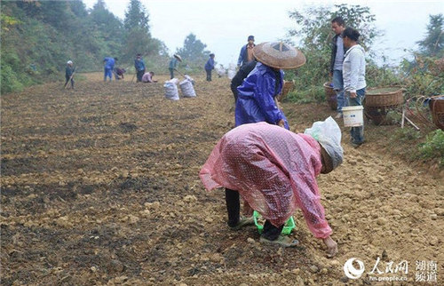 村民冒雨在山腰种植百合。