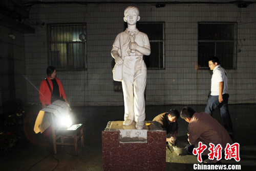 8月18日晚,在山西太原东仓巷,备受中国公众关注的赖宁雕像被迁回原址。中新社发 韦亮 摄