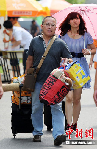 8月20日,南京东南大学迎来了首批“学生潮”。众多新生带着席子、被褥,电扇、手机、MP3乃至MP5、PSP、电脑前来报到。虽然学校和社会近年不断发出新生独自入学、培养独立能力的倡议,但家长对孩子考上大学的喜悦和执着的爱,让他们难却陪送的脚步,庞大的新生“亲友团”依然是大学校园迎新时节的一道风景。泱波 摄