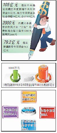■关键词:民族教育 围绕重点工作狠抓落实 教育规划纲要颁布实施一年来,民族教育紧紧围绕重点工作狠抓落实,落实了3个方面的经费:一是截至2010年年底,支持西藏及4个省的藏区教育发展各项政策措施已逐项启动实施,落实中央确定的藏区年度新增中央专项资金51亿元、地方专项资金及社会捐赠54亿元;义务教育农牧民子女“三包”经费标准由每人每年1200元提高到2000元。二是落实了新疆教育专项资金79.2亿元,协调19个对口支援省市重点支持新疆受援地区发展双语教育和中等职业教育。三是少数民族教育中央补助专项资金由每年1000万元增加到1亿元。 各类内地民族班规模逐年扩大,每年招生6万多人。其中,每年招收内地西藏班、新疆班1万人,内地中职班6000人,少数民族预科生近4万人,少数民族高层骨干计划5000人。 |