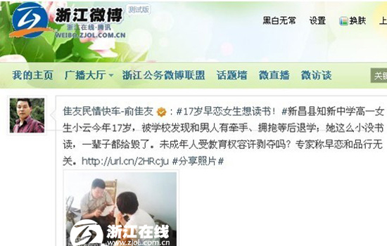 俞佳友发出微博,呼吁网友关注17岁早恋女生被退学事件