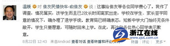 新昌县委书记温暖微博回应俞佳友 微博江湖,“围观就是力量”。浙江日报“佳友民情快车”栏目记者俞佳友自己都没有意识到,他的一条微博,将会改变一个面临被退学的女中学生的命运。 8月22日早上6:32分,俞佳友在浙江微博(weibo.zjol.com.cn)上发出这样一条微博。 “#17岁早恋女生想读书#新昌县知新中学高一女生小云今年17岁,被学校发现和男生有牵手、拥抱等行为后退学;她这么小没书读,一辈子都给毁了。未成年人受教育权容许剥夺吗?专家称早恋和品行无关。” 一条微博引来众多网友“围观” 虽然仍是清晨,但俞佳友的微博发出之后,短短几分钟内,迅速引来了众多网友“围观”,网友纷纷进行转播和评论。一场爱心关注的接力,在微博上延伸开来。 6:37分,最早关注这条微博的网友“呆子”发出感叹“学校的权力太大了!”。俞佳友迅即在浙江微博上与该网友互动,并发出倡议,“大家努力,帮女生出出主意吧,她该怎么办?” 倡议一出,响应者众。实名认证的浙江台州黄岩区委组织部副部长叶民国通过微博回应“这个女孩不能被退学,大家关注。”浙江三门县委常委,组织部长王辉也迅速转播了这条微博。 令人意想不到的是,新昌当地的热心网友“求国东”看到这条微博后,以微博特有的“找朋友”功能第一时间@新昌县委书记温暖。希望以此引起当地领导的关注。 记者注意到,俞佳友的这条微博,在不到一天的时间内,就被多达163位网友转播并评论。 早恋被退学,学校做法引发热议 一个17岁的花季女孩,仅仅因为和男生有过牵手、拥抱等行为就遭到退学,面临失学的境遇。微博上,网友纷纷对女孩抱以同情,同时对校方的做法展开热烈讨论。 网友“张铭”显然对其母校的做法不太认同,他在微博上说“知新中学是我母校,向来很严格的。发生这种事,学校也太苛刻了,现在的90后谁还没有个错的,重在教育,干嘛要剥夺她学习的权利嘛,唉,现在的中学教育还是停留在上个世纪。” 在微博上,“张铭”的观点得到网友惊人一致地认同和共鸣。绝大多数网友对校方做法感到不解,不少网友甚至提出批评和质疑。 网友“心素若简”指出,“学校不能动不动以退学来惩罚早恋的学生,孩子没教好,老师也是有过错的。如何正确对待每个孩子都会经历的春心萌动,如何引导孩子有个正确的心态,这是学校应该做的,而不是去剥夺他们受教育的权利。” 网友“祈晴姐姐”愤而转播,她说:“校纪能高于法纪吗?受教育是她的权利!为师不尊让谁来尊?公信力是大家给的,不是政府部门自己授予的。借读费也可以好好查查。当学生犯错误时,一味指责甚至采取过激措施,都会影响到成长中的孩子。” 网友“朱张文”善意提醒:“正确引导,教育为先,不要一味地强制作出处理,请多为青少年的将来想想。” 县委书记关注,失学女孩复学现转机 谁也没想到,失学女孩的事情会突现转机,而且,转机来得这么快。 8月22日中午12:43分,在俞佳友发出第一条微博六个小时之后,素以“微博控”声名远扬的新昌县委书记温暖微博“现身”,他通过手机发布了一条微博,以微博对话的方式对俞佳友正面做出回应。 温暖对俞佳友说:“这事让佳友等各位同学费心了。我作了调查,情况属实,该学生已2次长时间离家出走,学校在学生、家长签字同意的情况下,确办理了退学手续。教育局已明确表态,知新中学大门始终无条件敞开,学生只要愿意,可随时回来上学。在此,再次向各位热心同学表示歉意。” 县委书记的回应让关心失学女孩的网友如释重负,更赢得一片喝彩。网友“姓王的”对温暖书记的微博回应赞不绝口,他在浙江微博上评论道,“温暖书记第一时间网上回应以正视听,赞一记。”微博明星,浙江省省委宣传部副部长胡坚也在微博上对温暖的做法竖起了大拇指,表示赞赏。 “我和女儿都没想到,浙江日报报道当天,女儿无处读书的难题就得到了解决……”8月22日下午,退学女孩小云的父亲梁炎新得知女儿能重返校园就读,对俞佳友连连表示感谢。17岁的女生小云听到能重返校园读书的喜讯后,连说太好了。(记者 王俊) |