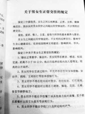 ■网友上传到猫扑网站上的“校规”照片。 -保定一所中学校规引热议,网友调侃称上学还得带尺子 -校方看中反对早恋的象征意义,学生违背不会一棒子打死,心理专家不看好其效果 8月24日,猫扑网上一条“高中男女生交谈距离不小于60厘米校规”的帖子,引发网友热议。这个由一匿名网友发的帖子称,保定市某中学为了防止学生早恋制定了“精确到厘米”的该校规。昨日记者经采访核实,该校今年新学生手册上的确有“男女生60厘米”规定。对这条校规的态度,校方却有着与网友不同的看法。 网友 男女交往很正常,如此校规过分 “高中男女生交谈距离不小于60厘米的校规你们伤不起啊!上学得带尺子”,8月24日,猫扑网上一名网友发表了这样一条帖子。 帖子内容显示,在保定市某高中学生手册中,“关于男女同学正常交往的规定”部分的第一条为:“除在正常教学、集会外,男女同学在教室、楼道、校园交谈,距离不小于60厘米;地点应选择在校内别人看得见、明亮的公共场所。”除了这条外,其余几条还做出了“男女同学在交谈过程中,不允许存在任何身体接触,如拉手、拥抱、互相拍打等肢体接触行为,男女同学不得在校园内结对散步、拉拉扯扯、打打闹闹,男女同学不能在学校餐厅或其他地方结对就餐,更不能在就餐时出现交头接耳等亲昵行为。” 记者发现,除了猫扑网,在该校的百度贴吧上,也有不少关于“男女生60厘米校规”的帖子。从众多回帖语气看,回帖者应该绝大部分都是尚未进入社会的学生。而回帖者的态度也是一边倒,绝大部分表示了反对和不解—— 犀利型:“这是有些过分了,男女交往太正常了,难道女孩子就不能跟男孩子成为好朋友吗?学生时代的朋友才是最纯洁的友谊啊。” 调侃型:“距离产生美?” 惊叹型:“这个也太强悍了。” 激进型:“直接弄成男子学校或女子学校不就行了么?” “只听说上了高中学校管得非常严格,可像这样精确到厘米的校规,让人感觉有些恐怖。”马上就要读高一的瑶瑶说,读初中时和男同学并肩走路、课间搞恶作剧开个玩笑的事情常有,估计距离都少于60厘米。“我想学校这么做,也是为了学生们好,就像我妈成天在耳边唠叨千万不要早恋一样。可我还是觉得这样管到厘米的校规有些别扭。” 学校 看中象征意义,表明不支持早恋态度 帖子中提到的“男女生60厘米距离的校规”确有其事吗?昨日上午,记者来到发帖者提到的保定市某中学进行核实。 “学生手册中的确有这样的规定。”该校主管学生德育工作的一位负责人坦承,并向记者展示了该校今年发给高一新生的学生手册。在该手册的第九页,记者找到了与网友帖子中一致的内容。对于制定“男女生60厘米距离校规”的初衷,该负责人表示,主要是为了向学生表明学校不支持早恋的鲜明态度。“高中阶段学生早恋问题,让家长们提心吊胆,也让学校感到头痛。”这位负责人表示,以前因为学生早恋耽误了学习,家长找到学校闹的事情没少发生过,给学校造成了很大压力。今年给新生编写学生手册时,学校负责德育方面的老师们一起开了个碰头会,商量制定一些能够提升校园文明、预防学生早恋的校规。考虑到原有校规中关于男女同学交往的部分描述过于含糊,比如“不得有过于亲密的行为”。但什么才叫“过于亲密的行为”却说不清。因此今年新生的学生手册中将这一规定更加细化,就有了“除上课、集会外,男女同学交谈时的距离不得少于60厘米”的规定。