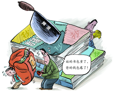 小学五年级学生刘珊欣放学回家后,从肩头上卸下沉重的书包,就久久地躺在沙发不吭一声。刘珊欣的妈妈称了一下书包的重量,总重5080克。书包里有语文、数学、英语、科学等5本课本,重1100克;《语文跟我学》《语文课课通》等2本语文辅导材料和1本数学辅导材料,重1050克;一台学习机、两叠厚厚的英语报纸和作业本加起来也有1460克重。“辅导书班里几乎人人都有,有的还不止这几本。”刘珊欣说,每次上课时,老师都会抽出一定的时间核对辅导书上的答案,没有买辅导书的学生只有自己看其他书。 “国外没有的。”在业内人士看来,教辅报刊的出现是独具中国特色的。 “一出生就是怪胎。”宁楠,曾任某教辅报纸主编。“目前很多教辅类报纸本质上只是借报纸之名,是以报纸形式出版的辅助性学习资料,却没有通常意义上报纸的时效性、新闻性。” 随着暑假的到来,教辅书市场又一次红火起来。广州购书中心在5楼专门辟出了教辅书区供家长和孩子选择。据书店负责人表示,教辅书一直都是最受欢迎的图书种类,而每年暑假,教辅书的销量都会比平时上涨4%-5%。 新华网长沙5月6日电(记者陈文广)为了减轻学生负担,杜绝校园教辅搭售、低价高回扣、教辅材料散滥现象,教育部等有关部门近些年连续下文,严禁任何部门、单位或个人擅自编印、统一征订教辅材料,印发教辅材料《推荐目录》,搭售教辅材料以及强迫学生购买教辅材料等行为。然而,湖南郴州市教育部门近日却被曝“顶风违规”出台教辅推荐目录,学校和老师通过低买高卖获取私利,学生“被自愿”购买指定教辅材料,存在“书商逐利部门分肥”嫌疑。 危害: 教辅多、滥加重学生负担 背后暗藏分成利益