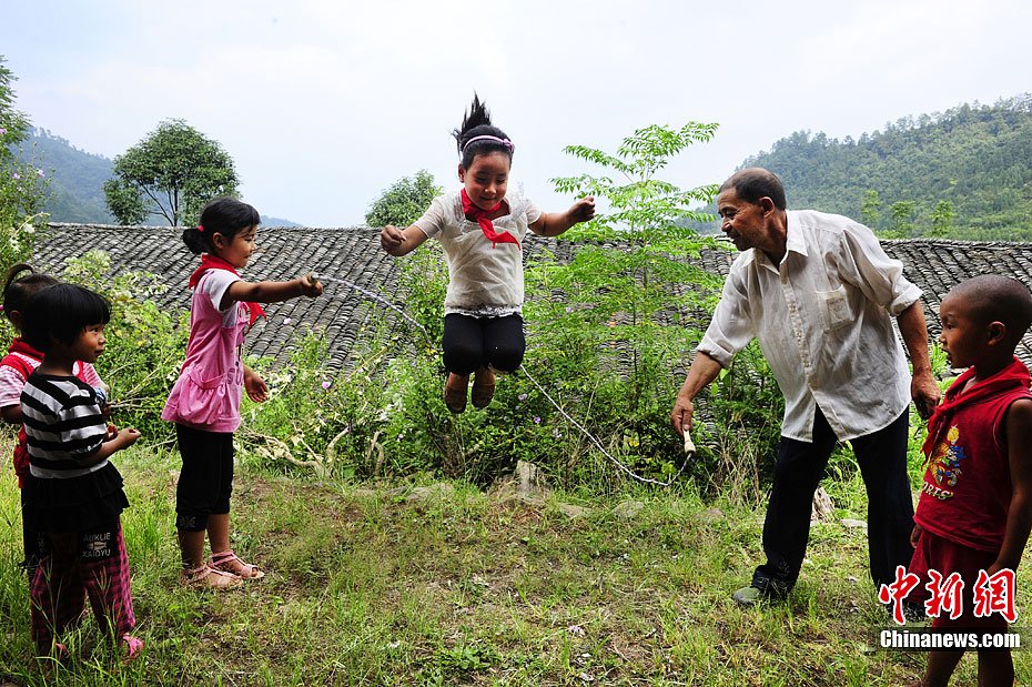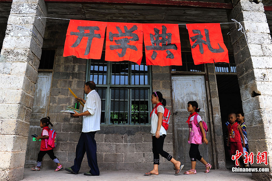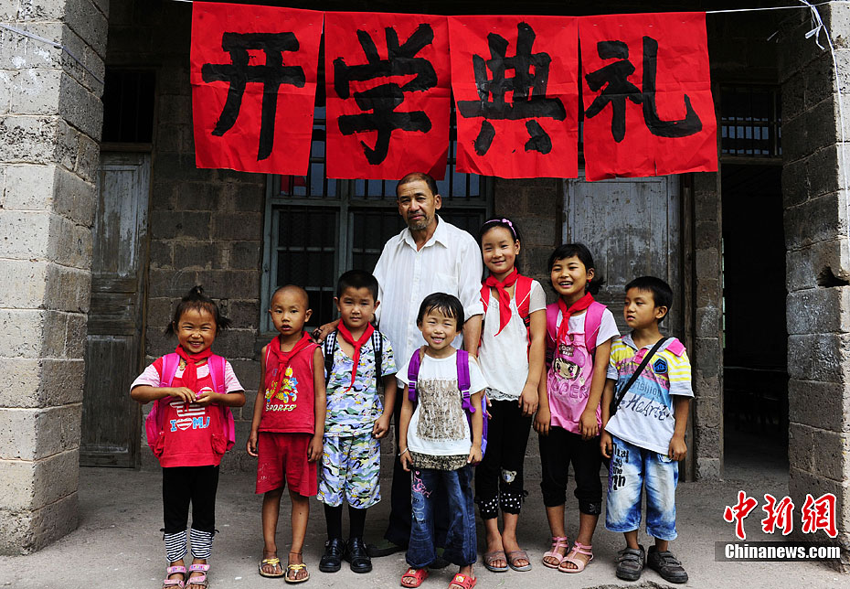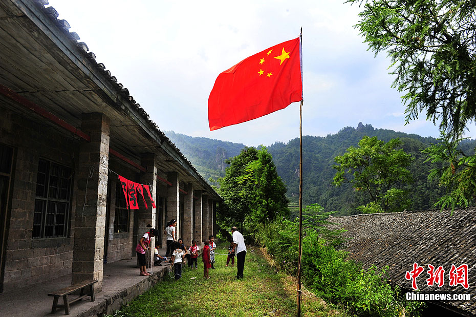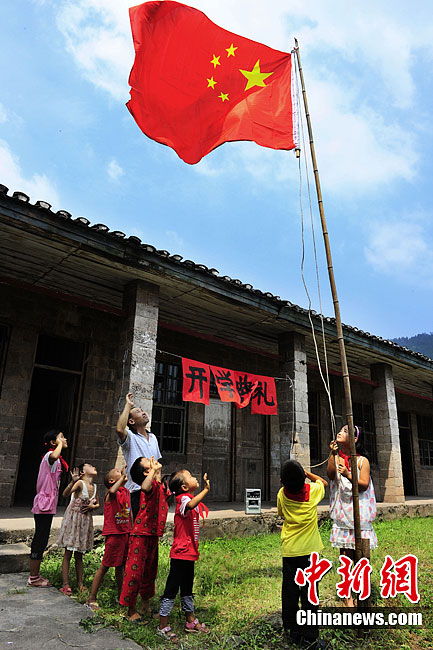 9月1日,新学期的第一天,天刚蒙蒙亮,田洪柏老师正领着学生举行开学升国旗仪式。旗杆是根4米多长的竹子,学生们佩戴着红领巾,仰望着飘扬的国旗,因地处偏远,县里保留了这个教学点,方便低年级的孩子上学。湖南省湘西土家族苗族自治州保靖县毛沟镇巴科村位于湘渝交界的山区,白坪学校巴科教学点就设在这大山深处。这里只有7名学生,分为学前班、一年级和二年级,56岁的田洪柏是唯一的老师。他与大山为伴,在此教书已有整整33年。据了解,1978年,23岁的田洪柏当上民办教师,开始了他33年的执教生涯。“要让孩子走出大山!”是他初握教鞭时立下的铮铮誓言。中新社发 郭立亮 摄 图片来源:CNSPHOTO