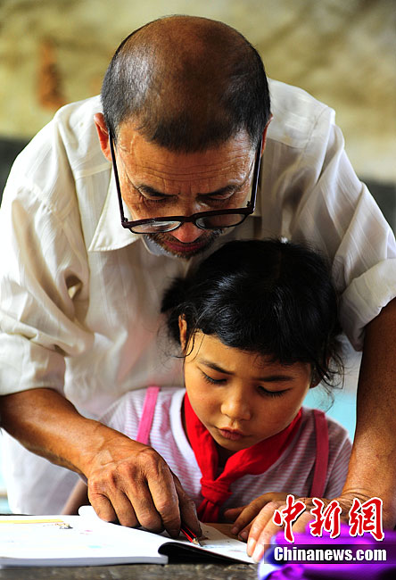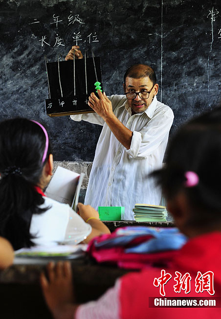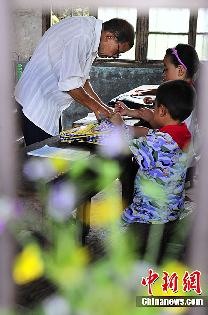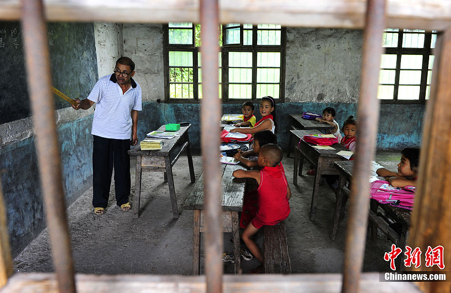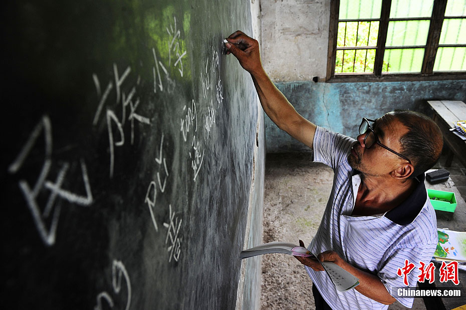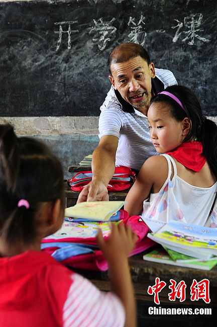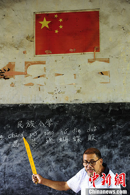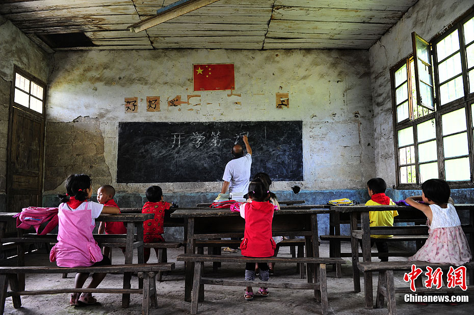 9月1日,新学期的第一天,天刚蒙蒙亮,田洪柏老师正领着学生举行开学升国旗仪式。旗杆是根4米多长的竹子,学生们佩戴着红领巾,仰望着飘扬的国旗,因地处偏远,县里保留了这个教学点,方便低年级的孩子上学。湖南省湘西土家族苗族自治州保靖县毛沟镇巴科村位于湘渝交界的山区,白坪学校巴科教学点就设在这大山深处。这里只有7名学生,分为学前班、一年级和二年级,56岁的田洪柏是唯一的老师。他与大山为伴,在此教书已有整整33年。据了解,1978年,23岁的田洪柏当上民办教师,开始了他33年的执教生涯。“要让孩子走出大山!”是他初握教鞭时立下的铮铮誓言。中新社发 郭立亮 摄 |
