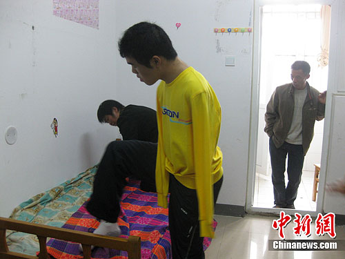吴建平和母亲一起整理床铺。贾真真 摄 中新网郑州9月14日电(贾真真)14日,用嘴咬笔答卷,并以超出二本线30多分的成绩,被河南省郑州轻工学院录取的无臂青年吴建平入校报到。 当日,虽阴雨连绵,身着亮黄色T恤的吴建平走在大学校园里,却十分地自信和洒脱。他告诉记者,希望通过努力,四年拿到本科和硕士学位。虽然预想到以后就业上可能会有困难,但是目前自己能做的,就是认真完成学业。 与他随行的还有父母亲等人,校方表示,吴建平的坚强和刻苦十分感人,由于其家境贫寒,学校将减免他一切学杂费,为其及陪读的母亲提供专门宿舍,并为在校内为其母亲安排了一份临时工作。 当日,受其精神感染的许多志愿者也来到校园送上支持,来自郑州红十字会的陈先生把募集的2000余元善款交给吴建平一家人。学校里的志愿者们也纷纷表示,会经常来帮助吴建平。 为了更好地学习,吴建平的家人从拮据的经济收入中抽出一部分为他添置了电脑。以前从未摸过电脑的他,最近一直在用脚练习打字,并摸索软件的使用方法,甚至还用软件把自己的照片ps后制成了电脑壁纸。 今年22岁的吴建平,家住河南省中牟县三官庙乡秦家村,父母为普通农民,家庭主要经济收入靠父亲出外打工。5岁那年,吴建平不小心碰到麦田中的变压器,不幸失去双臂。之后,母亲就把心思整个集中在照顾吴建平身上。 多年来,吴建平凭借顽强的毅力,练习生活技能,刻苦学习。平日里能做的家务他都会帮着母亲一起做。初中时,自己学会了骑自行车,每天往返四趟到距家四五里地远的学校求学,成绩优异。今年夏天,吴建平辛勤的付出终于获得回报,选报经济学专业的他说,希望将来自己能在经济研究领域有所成就。(完) |