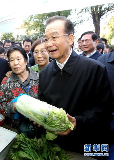 10月1日一大早,中共中央政治局常委、国务院总理温家宝来到北航社区,了解周末蔬菜直销市场情况,并向居民们致以节日问候。这是温家宝在询问白菜价格。新华社记者姚大伟摄