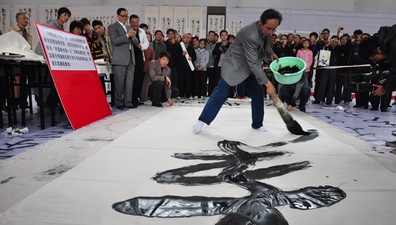 “中国榜书第一人”、著名书法家徐双喜右手拖着蘸满墨水的如椽白色巨笔,正在表演榜书书法艺术 今日下午,第八届湖湘书法月在湖南省展览馆举行,“中国榜书第一人”、著名书法家徐双喜现场书写榜书“寿”字,祝愿祖国62岁生日。 在活动现场,徐双喜右手拖着一支蘸满墨水的如椽白色巨笔,右手托着墨汁脸盆,从“寿”字上头重重开笔。然后左右上下一路轻快小跑,不到几分钟,一个草书“寿”字跃然纸上。现场立刻响起了热烈掌声。 徐双喜表示,适逢祖国母亲华诞,又将迎来九九重阳老年节。写这个寿字,祈祝祖国繁荣富强,也祝愿老人们幸福安康。不过,他透露说,因为展览场地有限,这个字是他写的最小的榜书字。而在去年11月,他在南岳衡山书写了高39米、500余平方米的长“寿”。 榜书,古曰“署书”,也就是“以大字题署宫殿匾额”。早在秦统一文字以前,榜书就出现了。据文献记载,第一位书写榜书的书家是秦丞相李斯,而第一位运用榜书艺术装饰帝王宫殿的书家是汉丞相萧何。 在榜书书法中,一般是户外创作,需要一次性成功,对写书者来说是体能和智能的双重挑战。“榜书”史上,有叹“一副榜书,三年酝酿,一笔写成,须发皆白”。5岁开始习书的徐双喜,虽身材瘦削,近年来专攻狂草和巨型榜书,师法怀素和王羲之,且一直致力于榜书的创作和研究,挑战世界“榜书”极限。(汤红辉 叶飞艳) |