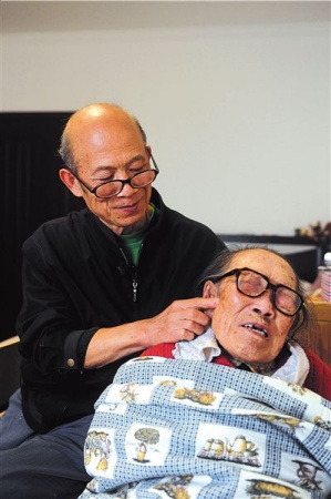 老师双目失明,而且听力不太好,宋金萍坐在床边帮她按摩耳根和太阳穴,并和老人聊聊天。 1956年,44岁的钟炳堃当了宋金萍小学六年级的班主任,让他感受到了慈母般的爱。当年生活困难,钟老师却给了宋金萍自己平时积攒的22元钱。每当饥肠辘辘难以坚持之时,他就拿出几分钱,买一个馒头填填肚子。 当时,年幼的宋金萍就暗下决心:“老师到现在没有结婚,我就要当她的儿子,长大后为她养老送终。”28年来,宋金萍一直坚守着承诺,即便自己年近古稀。 宋金萍与妻子确认恋爱关系之前,就把想赡养钟老师的想法跟妻子说明,并得到了支持。 1983年,宋金萍的女儿1岁,家里分到一处小两居室。他和妻子辗转找到独自居住的71岁的钟老师,将她接回家。 转眼之间,宋金萍一家三口已与钟炳堃一起生活了28年。回顾过往,宋金萍说,“确实也挺累的,特别是自己的年纪也大了。” 令宋金萍觉得异常安慰的是,自己有一位更伟大的妻子,并在二人潜移默化的教导下,他们的女儿也非常懂孝道。 “最重要的是,钟老师能有一个温暖的晚年。”宋金萍说。 镜头 “过了年就要100岁了” 10月22日下午2点,99岁高龄的钟炳堃在床上睡午觉,半导体收音机立在枕边,声音很大传出嘈杂的广告。宋金萍走到床边,小心把收音机关掉。 钟炳堃:谁呀? 宋金萍:还能是谁,我呗。别听收音机了,我念个报纸给您听听? 钟炳堃:听不清了。(笑)我都九十几了?(钟炳堃的手在枕头旁边摸索着) 宋金萍:99了,过了年就要100岁了。(宋金萍把她扶起来,从枕边拿起老花镜给她戴上,即使已经失明十几年,钟炳堃还是习惯一醒来就戴上眼镜) 钟炳堃:我1912年生人,马上要100岁了? 宋金萍:是啊。 钟炳堃:我正月生日。宋金萍:对啊,百岁生日您想怎么过? 钟炳堃:我马上要100岁了?我怎么觉得是九十二三呢?反正吧,我觉得像我这样享福的老人不多,真不多。 宋金萍:那就好好享福,活到110岁吧! 钟炳堃:我瘫在床上,心疼你们啊。( 记者 孙乾 摄影 记者 潘之望) |