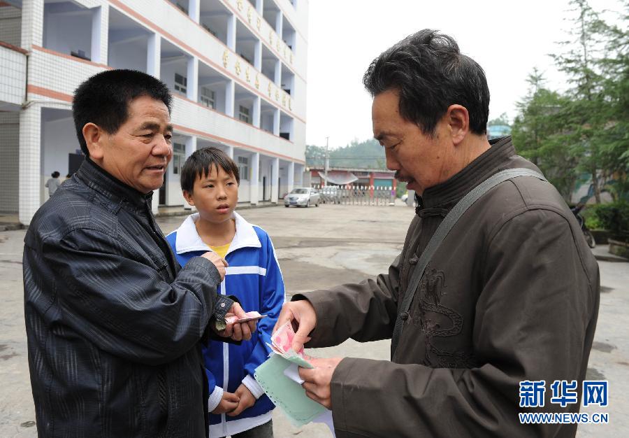 郑书明(左)为他资助的贫困生刘远牧(中)支付生活费(10月22日摄)。在重庆市黔江区,有一家“爱心旅馆”远近闻名。19年来,这家“爱心旅馆”免费为贫困学生提供吃住,至今已帮助300余名贫困学生圆了读书梦。而这家“爱心旅馆”的“店主”——郑书明,却是一位月薪仅有900多元的水泥厂的普通工人。 今年58岁的郑书明从1986年开始,25年如一日,将所有积蓄和精力都用在了贫困学生身上,自己却疾病缠身,至今仍住在单位狭小的职工宿舍。新华社记者 陈诚 摄