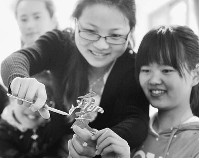 5月4日,浙江省上虞市特殊教育学校学生在用废弃易拉罐制作美丽的康乃馨。韩 坚摄