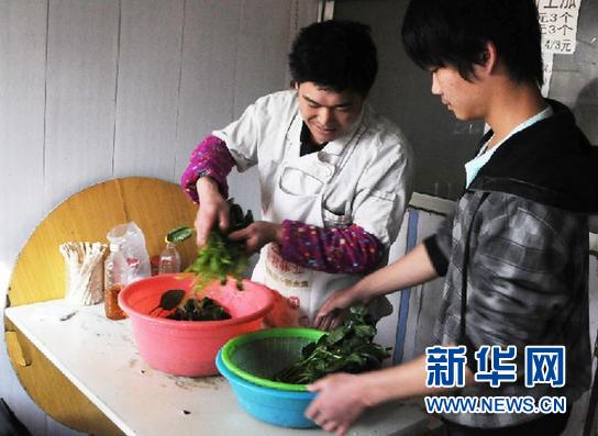 11月2日,馄饨店店主刘大军与儿子在店中洗菜。 新华社记者 张建 摄