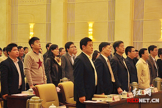 (今天,湖南省新闻工作者代表在长沙欢聚一堂,共同庆祝第十二个中国记者节。会议开始前,全体起立,耳畔响起嘹亮的国歌声。)