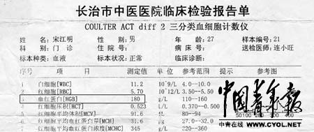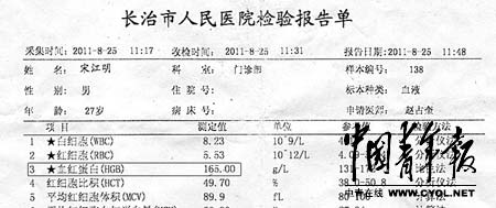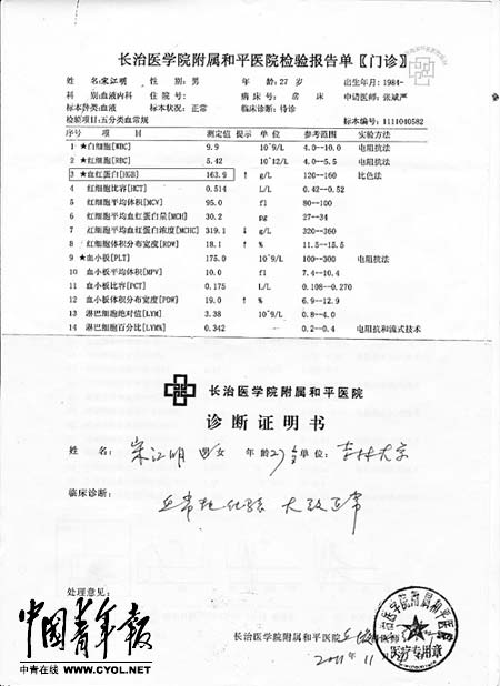 验血结果前后悬殊 复查在次日上午进行,宋江明在长治医学院附属和平医院体检中心抽了血用于化验。 由于不知道自己的身体到底出了什么问题,于是,宋江明向体检中心的医生咨询。医生告诉他,根据前一次的体检数据,有几项指标偏低,最坏的情况可能是白血病。复查的结果要下午才能出来,并直接送到长治市人社局。 在体检中心,宋江明和医生聊了大约半个小时才走出医院。他心里忐忑不安,“究竟是身体出了问题,还是对方在暗示我该‘活动活动’呢”? 想到公务员招考中可能存在的“潜规则”,出了医院后,宋江明给赵波打了个电话。在电话中,宋江明说,自己这两天感冒,吃了点药,可能会影响体检结果,“想和您当面聊聊,看能否再给我一次机会。”但赵波没有答应。 据宋江明回忆,赵波在电话里说,“你的身体不适合做公务员了,但是你可以从事其他的工作。如果你还在长治,有什么事情还可以找我。不要告诉父母,你要勇于承担。” 正是这话让宋江明感到疑惑。“下午出体检结果,我上午就被告知为不合格,为什么长治市人社局在体检报告出来之前就告知我为不合格?”他在网上发布的一条申诉帖子中这样写道。 当天11点多,宋江明接到一位好心人的电话。对方提醒他:“考公务员挺不容易的,别因为体检的原因被刷下来。你赶紧去找找领导吧,看看能不能送个礼什么的。” 当天下午,宋江明多次打电话或发短信联系赵波,对方一直未接电话,也没有回复短信。直到晚上6点多,赵波给宋江明打来电话说,体检复查中一项名叫“血红蛋白”的指标只有“88”,未能达到标准,所以体检不合格。 赵波还在电话里跟宋江明解释:你这个身体确实有问题,我不能再给你检查了,不然我会受处分的。 11月8日晚,记者多次联系赵波,但电话均未能打通。 根据国家颁布的《公务员录用体检通用标准(试行)》第三条,“血液病,不合格。单纯性缺铁性贫血,血红蛋白男性高于90g/L、女性高于80g/L,合格。” 按照赵波的解释,宋江明体检复查中“血红蛋白”一项的测量值只有88g/L,低于90g/L,不符合《公务员录用体检通用标准(试行)》第三条之规定。 于是,宋江明于8月19日、8月25日前往长治市中医医院、长治市人民医院验血;后来,又在9月4日和11月4日两次去此前曾参加体检和复查的长治医学院附属和平医院进行化验。这4次验血的结果是:宋江明的血红蛋白测量值分别是180g/L、165g/L、167g/L、163.9g/L。 4次测量值均高于90g/L,符合《公务员录用体检通用标准(试行)》第三条的规定。 此外,宋江明还拿着化验单到门诊看了医生,以排除患血液病的可能性。长治市中医医院的诊断证明书显示临床诊断结果为“感冒(WBC偏高)”(WBC是指白细胞——记者注),长治医学院附属和平医院的诊断证明书则显示临床诊断结果为“血常规化验大致正常”。 被要求“承诺不拿体检报告做文章” 自己去化验的结果与公务员体检的化验结果差距竟如此大,这让宋江明感到不解。8月20日,也就是宋江明第一次自行前往长治市中医医院体检的化验结果出来后,他来到长治市人社局公务员科,提出要复印体检报告,但没有得到批准。 11月8日下午,在接受中国青年报记者采访时,公务员科的一位工作人员解释说:“我们请示了省厅,省厅表示我们没有这个义务提供体检报告的复印件。” 宋江明告诉记者,公务员科的工作人员同意把化验单拿出来给他看一下。但按照公务员科负责人的要求,看化验单的前提是:他必须承诺不拿体检报告做文章。 宋江明承诺了之后,才看到自己的两次公务员体检化验单。从化验单可以看出,赵波提到的“血红蛋白”指标,第一次测量值是70g/L,第二次是88g/L,两次均低于《公务员录用体检通用标准(试行)》第三条的规定。 这是宋江明第一次看到自己的体检化验单。他告诉中国青年报记者,尽管他当即提出质疑,却遭到了公务员科工作人员的指责。对方说,你刚才承诺不做文章,现在却提出质疑,没有诚信。随后,工作人员便不再理睬宋江明。 宋江明只得又去找赵波,但没找到。他转而去找局长,却碰了一鼻子灰。宋江明告诉中国青年报记者,局长的答复是:“我正忙呢,你要再这样纠缠,即使体检过了,我也要让你政审不过。”随后,他被工作人员拉出了局长办公室。 多次申诉没有下文 在长治市人社局的遭遇让宋江明感到有些“寒心”了,他随后走上申诉道路。 他拨打长治市监察局的电话,反映人社局信息不公开的问题,对方先是反问“你怎么知道这个电话的”,接着又说信息公开的事管不了。 他拨打山西省招考领导小组的监督电话,对方说那是长治的事,管不了。 他拨打长治市的“市长热线”,却迟迟没有答复。“市长热线”打多了,连话务员都能听出他的声音来了——“你这事儿还没解决啊?那我再给你登记一次。” 由于宋江明体检未通过,第二名就递补上来了。11月8日下午,长治市人社局公务员科的工作人员告诉中国青年报记者,递补的考生已经被录用。 据宋江明的调查,第二名考生的专业是“资源环境科学”,而“科员2”岗位的专业要求是“环境资源法及相关专业”。根据《山西省行政机关2011年考试录用公务员公告》附件中一份名叫《公务员录用专业设置分类指导目录》的材料,“资源环境科学”属于第35类环境科学类,而“环境资源法”属于第10类法律类。 “第二名考生的专业显然不符合招考