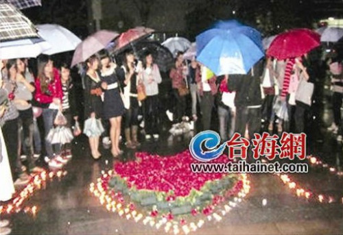 男主角站在心形玫瑰花丛前向女主角表白,引来许多学生的围观 900朵玫瑰在地上摆成一个心形,手里还捧着99朵,将蜡烛点燃并在雨中摆成大大的“Iloveyou”。前天晚上8点左右,集美大学一男生站在宿舍楼六社区五组团附近向一名心仪已久的女生表白。但这样高调“烧钱”的表白方式却在校园里引发了“浪漫还是浪费”的争议? 以999朵玫瑰雨中告白 前天晚上9点半,一个微博名叫“Summer_想掀西瓜皮了V”的集美大学学生发布微博称:“集美大学六社区五组团雨中表白门事件!地上900朵玫瑰,女生手中99朵。看来都是想在光棍节前‘脱光’啊!”并附上了一张现场的图片。不到一天的时间,这条微博就被人转载多次,并有不少人回复博主。 “当时宿舍所有人都轰动了,能跑出来的全都跑出来看了。”当时在场的集美大学向同学告诉记者,自己就住在附近的宿舍楼,听到楼下一阵骚动,还有人在惊呼,自己跑出来一看,哇,地上好大一束玫瑰,一个穿黑衣服的男生手里还捧着一束玫瑰,蜡烛在地上摆成了“Iloveyou”的形状,男生正向旁边的长发女生告白呢,已经有不少人打着伞围观。 “男向女的表白,场面很轰动哦。”一名集大同学说,这名女生是外国语学院大二的学生,男生是工商学院大三的学生,在玫瑰的强大攻势下,女生接受了男生的告白。这名黑衣男学生见表白成功了,于是告诉围观的学生,地上拿不走的玫瑰每人都可以拿一朵,只要送他们俩一句祝福的话就行。 是浪漫还是浪费? “都在想尽一切办法‘脱光’啊!”一名学生感慨道。而微博名为“问道社_集美大学”的博友也发表微博称,估计2011年11月11日之前,稍微花点心思的表白,成功率会很高。 在“光棍节”到来前,以如此高调表白的方式成功牵手的两名大学生引起了人们的关注,其中不少人觉得这样很浪漫,但也有人觉得大学生不该这样花钱,有点浪费。 “这个女生今生无憾了!羡慕嫉妒恨、吞口水。”校园里的一名女学生小苏在接受记者采访时,不禁感叹。除此之外,不少女网友觉得这样的表白很唯美,如果自己的生命中没有出现过会很遗憾。 “如果把999朵玫瑰换成999块蛋糕就好了。”有人在微博上留言。另外有不少网友则表示,999朵玫瑰,在节日期间价值至少数千元,大学生这么做似乎太高调了一些,而且花费太多,浪费啊。“羡慕是羡慕,但这是在‘烧钱’啊,我有心无力。”校园里的一名男生对记者说。(海峡导报 记者 樊文岑 文/图) |