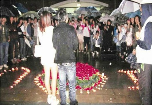男生999朵玫瑰雨中高调表白 浪漫还是浪费引争议