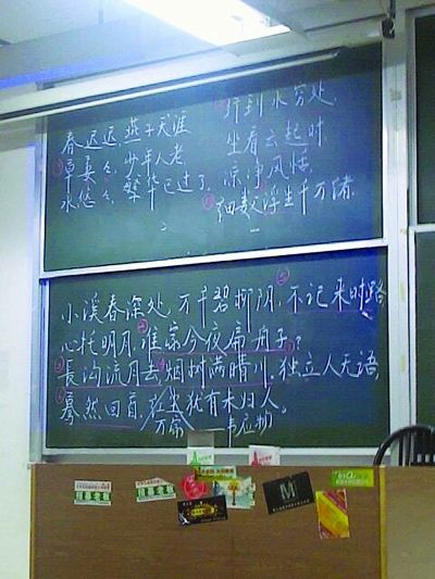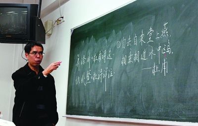 网友上传的俞老师手写板书。 实习生 张可 本报记者 蔡蕴琦 学生说俞老师的手写板书是“艺术品” “春迟迟,燕子天涯”很明显,网上流传的这幅隽秀的字出自一名古文老师之手。经过一番调查,记者了解到,这是南京师范大学新闻与传播学院的教师俞香顺在上古代文学课时书写的,发帖者正是他的学生。记者近日走进俞香顺老师的课堂,亲自感受了一番。 当天正是古代文学课,俞香顺老师给大一学生讲《杜甫诗选》,他先根据讲义的顺序进行讲解,遇到一些需要引申展开的知识点时,就开始把相关古文、诗歌书写在黑板上。在网络上有学生称俞香顺老师所板书的粉笔字被称为“柳杨体”。果然,黑板上每个字都保持在近手掌大小,字型瘦长、飘逸,字迹隽秀、清晰。在板书后,俞香顺老师还会就此板书逐字讲解。在一堂课的时间里,大约4米长,1米多高的黑板上,俞香顺老师会用粉笔字板书的内容约占两个黑板。每次俞香顺老师板书时,讲台下都发出“啧啧”的赞叹声。记者注意到,很多同学拿出笔记本,跟着老师抄写。 “俞老师的粉笔字就像艺术品一样”。下课后,班上的王同学说。据介绍,上课的是新传院部分专业的大一学生,他们告诉记者,“每次上课大家都很享受俞老师的粉笔字。”王女士已从南师大毕业7年,目前在一家媒体工作。她现在仍然记得俞香顺的粉笔字。“俞老师的粉笔字可是全院闻名的,每个他教过的学生都记得他一手漂亮的粉笔字板书,”王女士说,“而且俞老师儒雅潇洒,上课旁征博引,我们都很崇拜他。” 1996年开始教师生涯,俞香顺一直保持着上课手写板书的习惯。“写了这么多年,粉笔字的水平应该会有所提高的。”得知自己的粉笔字板书成为网络热点,俞香顺老师谦虚地说。俞老师说选择手写板书,因为手写的文字有利于表现文学作品中的美感。“而且我在用粉笔板书的时候,经常能即兴想到其他知识,方便与同学们分享。”俞香顺老师说。 记者调查 80%大学老师上课只点鼠标不用粉笔 记者昨天调查了南大、南师大、南中医等五所高校的30名学生,据他们反映,课堂上坚持用粉笔字板书的教师已不足20%,理工科课程中用粉笔板书的老师更少之又少。大部分老师只点点鼠标,播放事先准备好的PPT课件,就能讲完一堂课。这也就不难理解为何俞香顺老师这手粉笔字受到众多网友的关注。 南京某高校一位年轻教师告诉记者,刚工作时,他还希望延续传统,用粉笔板书给学生上课。但随着阅读方式、书写方式的电子化,他在写板书时经常出现“提笔忘字”的情况。“有时遇到一个字写不出来,卡在那,学生们就在下面偷偷笑话”,他说,“那时我刚做老师,这种事很打击自信,所以索性用PPT作课件。”在采访中,有同学向记者透露了一件老师写粉笔字的“雷事”。一名老师上课从来不用粉笔写板书,只用PPT课件。一次在课堂上,她不知从哪来了兴致,在黑板上大笔一挥,写下一句话。之后居然在讲台上“卖萌”地对学生们说,已经很久没有写粉笔字了,不知写得怎么样。同学们抬头一看:一行字写得东倒西歪,里面还夹着一个错别字。 大学生上课不带纸笔带相机或U盘 老师的教学方法在改变,大学生们的学习方法也相应出现了变化。在老师用PPT课件上课的课程中,学生不再埋头记笔记,而是兜里揣着一枚U盘,等着下课到讲台上排队拷贝PPT课件。 在一堂形势与政策课的课间,十几位同学拿着U盘来到讲台前,老师见状便心领神会地走到一旁,让这些同学方便到讲台的电脑上拷贝PPT课件。一名姓李的同学告诉记者,上课不记笔记的现象在班上十分普遍。小李告诉记者,上课时老师用的都是PPT课件,知识要点“啪啪啪”地点点鼠标就翻过去了,笔头根本就赶不上。“学期开始时,我曾尝试过在老师使用PPT课件的情况下用笔记记录知识要点。一段时间后,我发现记笔记根本跟不上老师用PPT课件讲课的速度。”小李说。据介绍,为了适应老师上课方式的变法,大学生们也在用高科技电子产品“武装”自己。南京一所高校的吴同学告诉记者,课堂上经常出现闪光灯不停闪烁的现象。原来,班上有同学为了记录老师的PPT课件,特意带了数码相机来上课。 |