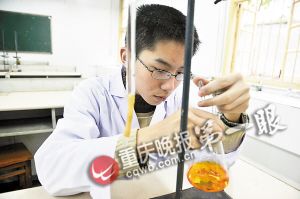 王裕栋做实验时神情专注。 14支生日蜡烛一一点燃,烛光映红了男孩脸庞。他腼腆地坐在生日蛋糕前,吹了好几次,才将蜡烛吹熄。 男孩是南开中学高二(5)班的学生王裕栋,这个14岁生日有点特殊———三天前,王裕栋在全国中学生化学奥林匹克竞赛冬令营中获得金牌,北京大学当场提前录取了他。 王裕栋父母在开县陈家中学任教。得知儿子将被保送上北大,桂小芬特地赶来为儿子庆祝。 12:30 过生日 问什么经常只答两个字 昨中午12时30分,王裕栋的生日会在南开中学旁的金麟酒楼开始了。来为王裕栋庆生的,都是他最亲近的人:母亲桂小芬、高一时的班主任肖军、现在的班主任刘春玲、化学竞赛教练贾龙贤、年级主任佘宗平。 现场,王裕栋有些拘谨。不管重庆晚报记者问什么,他总是略带羞涩地轻轻地吐出几个字,很难讲出一大段话。“我们两口子都学文科,平时打开话匣子就收不住,儿子却长了一颗理科脑袋,喜形不露于色。”桂小芬说,自己教英语,丈夫教语文,但儿子性格却很沉默, 重庆晚报记者问:“除了化学,你平时还喜欢什么?”王裕栋眨了眨眼睛,歪了下脑袋,等了几十秒也没有回答。 肖军老师在一旁提醒:“你不是喜欢打篮球么?”王裕栋点点头,算是回答。 “那你一般什么时候打球?”“周末。” “平时跟班上同学交往多不多?”王裕栋嘴角露出笑意,又点点头:“嗯,多。” 13:30 回房间 把化学书当成小说看 午饭后,王裕栋和母亲一起回到出租屋。这套两室一厅的小房子,在南开中学老教师家属楼。“一年租金一万八,有点贵。”桂小芬边收拾屋子边说,但考虑到儿子参加化学竞赛,需要额外看书做题,夫妻俩才租了这间房子。 “平时是他外公在这里照顾他,最近太冷,他外公才回(开县)去了。”桂小芬说,自己放心不下儿子,几乎每个周末都会坐长途车过来看他。 在其中一间卧室,重庆晚报记者看到,王裕栋书桌一侧摆了一排书籍,全是高中各科教辅资料,没有一本小说。桌面散放的几本书,是化学试题集。桂小芬说,王裕栋对化学已经到了痴迷状态,每天下自习课回家,就把化学书当成小说看。 王裕栋的化学竞赛教练贾龙贤介绍:“为参加竞赛,他(王裕栋)把去年到1995年每一年的竞赛题,统统做了一遍。” “周末出不出去逛街?”“很少。”“那呆在学校做什么呢,一直做题么?”“那倒不会,”王裕栋说,我会去操场锻炼一下。 14:00 实验室 面对瓶瓶罐罐变了一个人 从王裕栋家里出来,正好碰到同学们上课。突然,三个女生从人群后追上来,大声招呼:“王裕栋!”他闻声回头,一下又不好意思地低下头。三个女生笑着大步从他身边走过。 她们是王裕栋的同班同学。“他(王裕栋)在我们眼里完全是小朋友,天真纯朴得很。”一名叫罗瑶女同学说,王裕栋几乎不敢跟女同学说话。“但我们都很佩服他,(年龄)这么小,这么凶,我们都考不赢他。”另一名女同学张晨说。 来到化学试验室,王裕栋一下子变得不一样。摆支架、取试管、上夹子……他动作很熟练,脸上也露出沉稳的表情。进行滴管试验时,他左手扶住滴管开关,右手轻轻摇晃试瓶,全部注意力集中在手上试瓶里的溶液,旁边照相机的闪光灯和快门,似乎全都不存在了。 贾龙贤称,前几天在长春参加化学奥赛冬令营时,王裕栋做实验意外将试管打破被扣5分,“他现在做试验更小心了。虽然最后得了金牌,但毕竟出现了差错。”贾龙贤说,王裕栋一下场就主动总结了经验。 妈妈谈成长 小学五年级写出论文 《关于空气和呼出气体的成分差别》 小学四年级结缘化学 化学课初三才开设,王裕栋却因为一次偶然,小学四年级就与它结缘。 桂小芬说:“王裕栋读四年级时,我正教初三。订教材的老师统计失误,多订了一本化学书。没人要,我就把它带回家了。” “后来放暑假,王裕栋对那本化学书产生了兴趣,没事就拿出来翻。”桂小芬说,没有人教他,儿子是无意识地看。 五年级一开学,学校组织同学参加一次全市小学生科普小论文比赛。王裕栋根据暑假自学的那点化学知识,在父母和老师指导下,写了一篇小论文《关于空气和呼出气体的成分差别》,一下获得了全市一等奖。 这个意外的成绩,让王裕栋对化学的兴趣更浓了。 10岁上初二月考年级第一 “他小时候,几乎没做早教,没学特长。我们最担心他的身体。”桂小芬说,儿子那时特别瘦,脑袋大、身子小,还得过一个绰号“大头儿子”。 上小学开始,王裕栋表现出学习方面的天赋,“考试成绩几乎一直排第一名。记忆力特别好,很多东西一学就会。”桂小芬说,五年级时,家人和老师发现小学内容不能满足他了。 桂小芬夫妇计划让儿子跳级。“刚开始计划跳一级。但当年陈家中学生源爆满,一个班挤了上百人。”正好有熟悉的老师在初二任教,家人决定让王裕栋试着直升初二。 “不得行,再留一级回来读。”昨日,桂小芬对重庆晚报记者回忆,没想到,10岁的王裕栋第一个月月考考了全年级第三。 这下,他在学校出名了,同学们给他冠以“神童”称号。 化学神童最怕作文 去年9月,12岁的王裕栋考入南开中学读高中。“哇,他才12岁啊!”班里同学一阵惊呼。 因为年龄比同班同学普遍要小三岁,大家亲热地喊他“小朋友”。“小朋友”每次考试,在班上总是名列前茅,即便在全校2000多名学生中,也排在前五六十名。 “主要是语文成绩差点。”王裕栋高一时的班主任肖军老师介绍,刚入