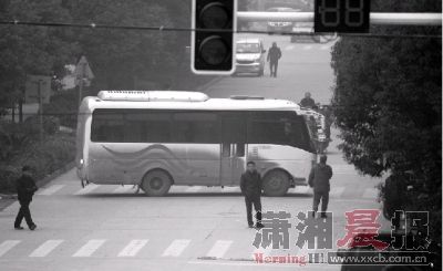 昨日,岳麓区望新小学附近,在黄桂顺等家长的一再要求下,一辆巴士终于掉头离开。图/记者辜鹏博