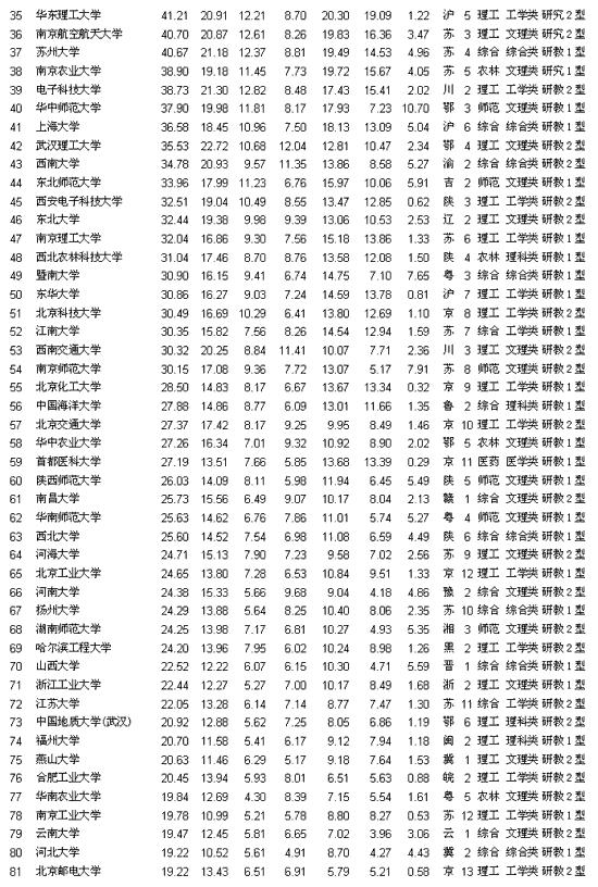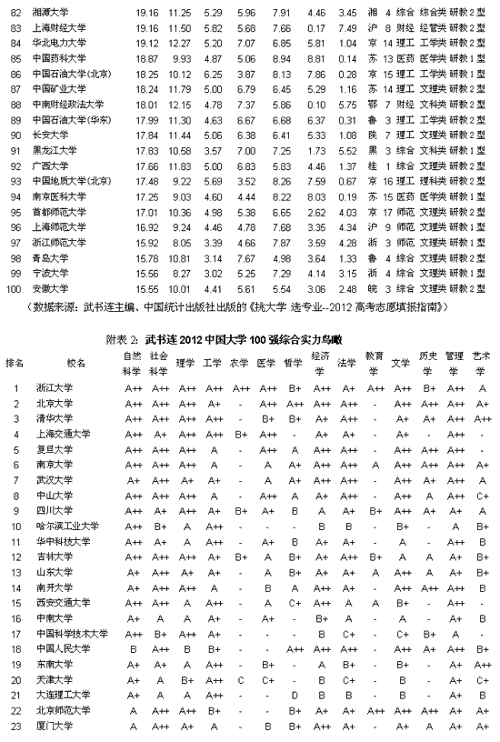 相关新闻 武书连主持的《2012中国大学评价》课题2011年11月结稿。中国统计出版社当年12月出版发行了武书连主编的《挑大学 选专业--2012高考志愿填报指南》。这是中国统计出版社连续第11年出版发行这部深受考生和考生家长欢迎、并有着广泛社会影响力的高考志愿填报参考书。 《2012中国大学评价》在保持全国大学综合实力排名为主线条的基础上,增加了4项集中反映学校办学质量的重要指标排名: 1、全国大学教师平均学术水平排名; 2、全国大学教师绩效排名; 3、全国大学新生质量排名; 4、全国大学本科毕业生质量排名。 公布上述反映大学办学质量的指标,是为了方便考生和考生家长从多个视角观察和比较大学,以便从容挑选自己最理想的大学。 一、综合实力排名 浙大北大清华蝉联三甲 在武书连2012中国大学排行榜中,浙江大学以209.62分蝉联冠军,北京大学以205.14分蝉联亚军,清华大学以191.51分蝉联季军。获得第4名到第10名的大学依次是:第4名上海交通大学、第5名复旦大学、第6名南京大学、第7名武汉大学、第8名中山大学、第9名四川大学、第10名哈尔滨工业大学。 支持浙江大学蝉联2012综合实力冠军的主要指标依然是该校的学术影响力:在2006年1月至2011年6月的5年零6个月的评价跨度时间内,浙江大学国内外论文他引(即排除作者自引后的引用,以下同)次数继续列全国大学第1名,其中国际论文他引第1名,国内论文他引第2名。论文他引次数是国际公认的反映大学学术影响力的标志性指标,也是武书连科研评价体系中权重最高的指标。浙江大学国际论文他引第1名标志着该校的学术影响力在世界范围内已居中国大学之首。 此前,自1993年武书连发布第1个中国大学排行榜起,中国大学综合实力第1名非北大清华莫属。特别是清华大学,自1997年到2010年,连续14年第1名。2011年起,浙江大学首次获得综合实力第1名,2012年蝉联。 二、教师平均学术水平排名 复旦第一 在2012中国大学教师平均学术水平排行榜上,复旦大学以5.1941分摘金牌,南京大学以5.1197分获银牌,浙江大学以5.0162分得铜牌。获得第4名至第10名的大学依次是:第4名清华大学,第5名北京大学,第6名中国科学技术大学,第7名上海交通大学,第8名南开大学,第9名中山大学,第10名中国人民大学。 三、教师绩效排名 南大第一 在武书连的2012中国大学教师绩效排行榜上,南京大学以4.9832分荣获第1名,复旦大学以4.7863分取得第2名,北京大学以4.7253分屈居第3名。获得第4名至第10名的大学依次是:第4名浙江大学,第5名中国科学技术大学,第6名清华大学,第7名南开大学,第8名中国人民大学,第9名北京师范大学,第10名上海交通大学。 四、本科毕业生质量排名 清华第一 根据《挑大学 选专业—---2012高考志愿填报指南》的排列,在全国大学本科毕业生质量排行榜上,清华大学以5分居首,复旦大学以6分次之,北京大学以7分再次之。获得第4名至第10名的大学依次是:第4名浙江大学9分,第5名中国科学技术大学9分,第6名南京大学10分,第7名上海交通大学11分,第8名中国人民大学17分,第9名南开大学21分,第10名北京师范大学27分。 五、本科专业第一名数量 北大第一 在《挑大学 选专业—2012高考志愿填报指南》中,武书连对12个学科门的270个本科专业做了排名。北京大学以25个本科专业第1名蝉联冠军,清华大学以20个本科专业第1名蝉联亚军,浙江大学以13个本科专业第1名蝉联季军。获得该项评价第4名到第10名的大学依次是:第4名中国人民大学12个,第5名北京师范大学10个,第6名上海交通大学9个,第7名中国农业大学8个,第8名南京大学7个,第9名复旦大学、哈尔滨工业大学、(各6个,并列)。以上本科专业第1名不包含在5个及以下大学设置的专业。 六、新生入学质量排名 清华第一 在2012中国大学新生入学质量排行榜上,清华大学获第1名,北京大学第2名,中国科学技术大学第3名。获得第4名至第10名的大学依次是:第4名上海交通大学,第5名复旦大学,第6名浙江大学,第7名中国人民大学,第8名南京大学,第9名同济大学,第10名外交学院。 七、全面修订了保持10年的中国一流大学标准 中农大大连理工北航东南大学华东理工入围 武书连在《2012中国大学评价》中,全面修订了保持10年之久的中国一流大学标准。2011年以前的中国一流大学标准是:“在中国大学评价中,入选研究1型的大学;或者获得工学前6名,理学、医学、管理学、文学前4名,经济学、农学、法学前2名,历史学、教育学、哲学第1名的研究型大学(需进入中国大学前30名)”。 2012年中国一流大学的标准是:“在中国大学评价中,同时满足以下三个条件的大学:1、教师平均学术水平居全国大学前25名。2、教师绩效居全国大学前25名。3、本科毕业生质量居全国大学前25名”。 据此标准,2012中国一流大学的数量由上年的15所扩大到19所。复旦大学(5分)、南京大学(9分)、浙大大学(11分)、北京大学(11分)、清华大学(11分)等14所学校依次入选。中国农业大学、大连理工大学、北京航空航天大学、东南大学、华东理工大学等5所大学新入围。 2012年19所中国一流大学中,有18所985工程大学,1所211工程大学。 八、浙大北大清华上交大等校入选2012研究型大学 在《挑大学 选专业—2012高考志愿填报指南》中,作者依据上年标准,列出了中国研究型大学名单。浙江大学、北京大学、清华大学、上海交通大学、复旦大学、南