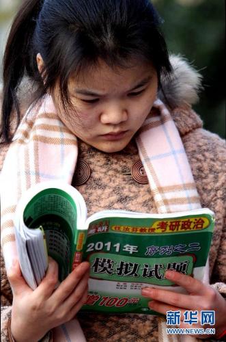 1月7日晨,在上海师范大学考点,考生在进入考场前抓紧温习。 当日,2012年全国硕士研究生入学考试开考。在上海参加考试的4万余名考生在全市的10个考点、1117个考场参加考试。2012年全国共有165.6万余名考生报名考研,比2011年增加9.6%,再创历史新高。 新华社记者 刘颖 摄