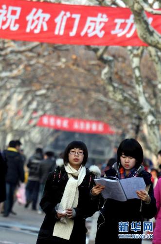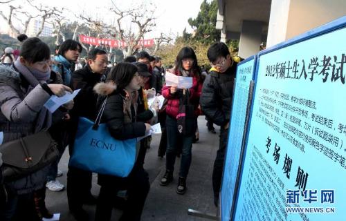 1月7日晨,在上海师范大学考点,考生们在查看考场信息。 当日,2012年全国硕士研究生入学考试开考。在上海参加考试的4万余名考生在全市的10个考点、1117个考场参加考试。2012年全国共有165.6万余名考生报名考研,比2011年增加9.6%,再创历史新高。 新华社记者 刘颖 摄
