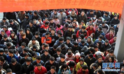 1月7日晨,在上海师范大学考点,考生们准备进入考场。 当日,2012年全国硕士研究生入学考试开考。在上海参加考试的4万余名考生在全市的10个考点、1117个考场参加考试。2012年全国共有165.6万余名考生报名考研,比2011年增加9.6%,再创历史新高。 新华社记者 刘颖 摄
