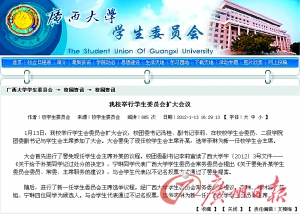 广西大学网站对孙某罢免决定。 遭广西大学记过处分 校方称该校学生会主席重选 正值期末考试时,很多在校大学生为防“挂科”费尽“心机”,勤奋者熬夜复习,当然,也会有学生会选择铤而走险。近日,广西大学学生孙某,就因作弊被监考老师当场“擒获”。不过,这位孙姓同学非比寻常,他是中华全国学生联合会驻会执行主席、广西大学学生会主席,此事一出,一时舆论哗然。近日,记者从广西大学宣传部获悉,孙某已被罢免学生会主席,同时受到记过处分。 学联任职 去年9月赴京“履职” 据广西大学党委宣传部的高老师介绍,孙某是去年开始担任广西大学学生会主席职务的。去年9月5日,孙某走入了他学生干部事业的高峰,并成为全国学联驻会执行主席。 广西大学官方网站消息显示:“我校学生委员会主席、化学化工学院2008级学生孙一当选全国学联驻会执行主席,并已赴北京承担全国学联的相关工作,为期一年。孙一同学此次当选,经过了我校团委和共青团广西区委的共同推荐,全国学联组织的笔试、面试、政治审查等选拔环节,凭借个人优异表现与各级团组织的大力举荐,从数十名候选人中脱颖而出。孙一也成为我校当选全国学联驻会执行主席的第一人。” 疏于复习 作弊小纸条掉出 但如今,孙某的作弊行为让他非常难堪。据广西大学学生会的一位学生向记者透露,他曾与孙主席一起合作,他非常好相处,人缘特别好,他完全意料不到孙主席竟会作弊,“在学期开学的时候,学生会会集体赶制为新生准备的入学材料,孙主席那时是部长级的人物,但仍和大家一起通宵工作,以前学生会退任的部长路过也会和孙主席开玩笑:‘小孙,这么勤奋啊?’” 而孙主席的作弊过程到底是怎样的呢?据这位学生讲,孙主席是在考试最后几分钟,小纸条掉出来了,就被抓到了。 另据报道,广西大学的一名中层领导也证实,孙某是在1月11日的考试中,因作弊被发现。知情人士称,孙某对此次考试把握不大,或与其疏于复习有关。 严肃处理 记过处分记入档案 近日,广西大学党委宣传部的高老师表示,学校刚刚举行学生会委员会扩大会议,会上决定给予孙某同学记过处分,并罢免孙一同学学生会主席职务。大会还选举了新的学生会主席。高老师说,记过处分会记入孙某档案。 据悉,大会首先进行了罢免现任学生会主席孙某的议程。校团委副书记李莉宣读了广西大学字〔2012〕3号文件——《关于给予孙某同学记过处分的决定》,宁琳同学代表广西大学学生委员会常务委员会提出《关于罢免孙某学生委员会委员、常委、主席职务的建议》,与会学生代表以不记名投票方式通过了罢免提案。(武威 谢欣阳) |