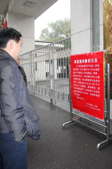 根据长沙市教育局的安排,长沙市所有中小学校已于1月15日之前放假。督察组首先来到长沙市一中,校园内一片安静,校门口立着的一块寒假期间静校公告牌表示,为了落实相关规定,规范办学行为,切实减轻学生过重的课业负担,学校决定自1月15日起至2月12日静校,期间禁止任何单位和个人来校举行任何形式的培训和补习活动,违者将严肃处理。