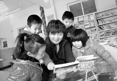 年炳辰非常有孩子缘。在镇文化大院内,他经常会跟孩子们一起看书、玩游戏等。图为年炳辰拿着卡通书,教小朋友识别应急自救图标。