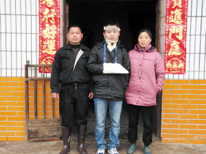 易亮(中)和他的父母。目前,易亮脖子上仍戴着颈托,右臂箍着绷带,体内还嵌着两块钢板。朱炎皇/摄 据《长沙晚报》报道 “最美妈妈”吴菊萍徒手接住坠楼女孩的事迹传遍大江南北,而在湖南湘乡市,也有一个曾张开臂膀去接坠楼同学而负伤的青年,他叫易亮,今年23岁,是湖南师范大学物理信息学院2010级自考生。近日,记者采访了他的英勇事迹。 记者见到易亮时,他脖子上仍套着颈托,右臂箍着绷带,体内还嵌着两块钢板。这一切都因为那场见义勇为的举动——2011年4月9日,受班主任的嘱托,同学彭凯邀易亮一同去看望患有抑郁症的同学张颐(化名)。两人来到学院宿舍楼,发现张颐站在宿舍7楼楼顶边缘欲寻短见。彭凯赶紧打电话报警求助,易亮则大声劝说张颐不要做傻事。不幸的是,张颐还是不听劝阻,从楼顶纵身跃下。 看到此景,易亮估量张颐落下的地点离自己有3米远,他来不及多想,便一个箭步冲过去,张开双臂想接住他。“咚”的一声闷响,张颐的身体重重砸在易亮的右臂,落地身亡。易亮当场昏迷,等他醒来时已躺在长沙市第四医院的手术台上抢救。 张颐体重大约60公斤,按照物理学方法计算,坠地时的重力达上千公斤。经医院检查,易亮被砸成重伤,肩、颈、肋骨等十多处粉碎性骨折。 易亮的父母都是农民,在深圳当保安和清洁工。当他们听说了儿子的伤情后,立马坐飞机来到长沙。住院期间,张颐的舅舅、伯父来看望过易亮,对他表示感谢,并送上500元钱,但被易亮婉拒。学校的领导、老师、同学也多次来探望他,并承担了6万多元的治疗费用。 一个半月后,恢复不错的易亮提前出院回家,但装在他右锁骨上的、颈椎胸椎上的钢板只有等一年以后才能取出,而且他还要佩戴头颈胸固定支具一年。易亮的受伤让一家人的生活陷入困境,父母为照顾他,双双辞去工作,举债7万多元为他疗伤,但所幸他身体恢复得还不错。 |
