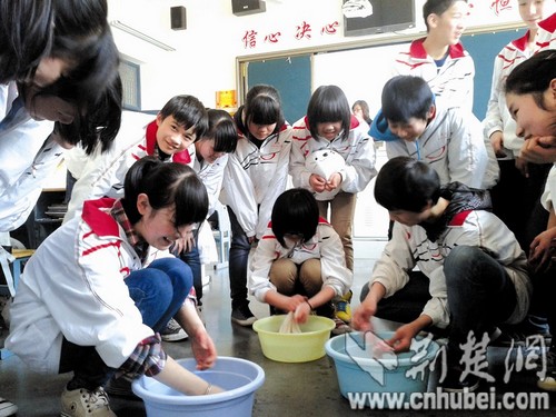 把洗脸盆、脏衣服等搬进教室,同学间相互比赛洗衣服,这样的课堂你见过吗?昨日(28日)上午,武汉市英格中学八(6)班就上了这样一节别开生面的“生活自理我能行”的主题班会课。 课堂上,班主任老师还公布了一项调查结果:约有三成的学生回家从不做家务。在学生自理能力较强的寄宿学校,这个结果还是让不少老师颇感意外。 课堂:学生比赛洗衣,家长一旁指导 昨日上午9时许,英格中学八(6)班,班主任老师腾晓荣一声“比赛开始”,3名学生陈婉琴、刘睿嘉、唐薇赶紧拿着自带的水盆去打水,洗起自己的T恤。起初,大家还很兴奋,可不一会手越搓越红,蹲着吃力,有名学生索性单腿跪在地上洗(如图)。 洗衣大赛邀请了家长当评委。孩子们奋力搓洗衣服时,家长可以在一旁观摩,但不允许代劳。看到孩子笨拙的模样,家长们坐不住了,从评委变身为“教练”:“洗衣粉洒均匀一点,洗出泡沫来。”“重点是衣领和袖口!” 一件单衣洗下来,学生感受如何?“还是有点累的。”刘睿嘉说,尽管是一件小衣服,但用力搓完手特别酸,“想到妈妈平时为我洗那么多衣服任劳任怨,自己既感动又自责。” 调查:打扫卧室仅15%,不做家务的占三成 腾晓荣老师是该主题班会课的策划者。她坦言,现在的孩子自理能力太差,普遍缺乏劳动热情,希望通过有现场体验的班会课,让孩子们体会到家长的辛劳,并认识自理能力的重要性。 课堂上,腾晓荣还公布了一项对班级39名学生的调查:在家自己洗衣服的占26.3%,整理床铺的占42.1%,打扫卧室的约15%,从不做家务的约占三成左右。“因为我们是寄宿学校,八成学生住读,学校对学生的自理能力比较强调。但通过我对孩子们寝室的观察,以及生活老师的反映来看,一些寄宿在校的孩子,在生活自理上做得并不太好,比如把脏衣服、袜子全攒着带回家给妈妈洗。走读的孩子,在家基本不做家务,一些寄宿生回家后也不做家务。”腾晓荣说。学生唐薇告诉记者,有同学刚来学校住读时,因为不会自理而大哭。 记者曾在武昌区粮道街中学做过调查,因为全是走读生,不做任何家务劳动的学生,占比高达六成。 反思:有家长认为“做家务还不如做几道题” 去年曾有新闻报道称,考上南方一所名牌大学的女生,在收到录取通知书后突然说要退学复读……这一切均因妈妈不在身边照顾。 “具有生存能力,能适应多变环境,是未来公民的重要素质之一。”洪山区教育局德育专家梁国林对现在学生的自理能力表示担忧,“学生的学习任务也比较重,没时间做家务,家长也不要求,觉得还不如多做几道题;还有家长有‘孩子做不做家务,远不如一次考试成绩重要’的想法。这种想法与素质教育以及孩子全面发展的理念相悖,家务事教育同样重要。” 英格中学副校长张新华表示,作为寄宿学校,学校一直在强化对学生的自理能力教育,如上主题班会课、在寝室由生活老师指导、将自理能力纳入对学生的评价体系等。(楚天都市报 记者罗欣 通讯员董缀文 卢建飞 实习生汤晔) |