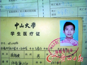 戚锦典的学生医疗证和病历。 因流涕、发热在急诊过程中突然病危 家属认为医院有过失 已申请尸检 文、图/记者饶贞 还有3天就是他的26岁生日,可是他却等不到这一天了。还有2年,他的老父母就将看到贷款上大学的儿子穿上博士袍的样子,可是这对老父母也等不到这一天了。4月11日,25岁的中山大学环境科学与工程学院直博生戚锦典因流涕、咳嗽、发热等不适,独自一人前往医院看病,在急诊接受了输液等治疗。4月12日一早他再次前往医院看急诊,却在接受输液等治疗过程中突然抢救无效,当天下午离开了人世。 “太可惜了,明天就是他26岁的生日了!” 昨日下午,从广东湛江赶来的戚锦典的亲属默默凝视着他的死亡医学证明书说。昨日,他们将戚锦典的遗体送至中山大学法医鉴定中心进行尸检,家属认为负责救治的医院在治疗过程中有过失,导致了戚锦典的死亡。 家属疑问: 为何没有及时转院? 记者昨日在戚锦典的死亡医学证明书上看到,他的“死亡原因”是“心室颤动”。但戚锦典的亲属认为,是医院在救治过程中存在过失,才导致其死亡的。于12日傍晚赶到医院的戚锦典的同乡林先生向记者表示,新海医院的一位医生在后来向戚锦典的亲属解释抢救情况时曾说,他曾向患者同学提出转院建议,并主动联系了177医院请对方出动救护车,但患者同学表示要请示老师,并表示老师建议转至中大自己的附属医院,于是这位医生便取消了177医院的救护车。但林先生转述的该医生的说法,与戚锦典的同学向记者所说的情况显然不一致。 董同学表示,无论是医生一开始说要住院,还是后来说要转院,他都是表示同意的。 此外,新海医院医务科科长刘先生表示,家属还怀疑医院在救治中使用的药物可能存在问题,并表示已封存了部分输液袋作为证据。 记者昨日致电新海医院医务科科长刘先生,希望了解医院方面的说法,但刘先生表示“事情一直在变化中”,并以“今天不方便在电话中谈”为由拒绝接受采访。 痛失英才 系里首位免试直博生 “他总是非常热心地帮助别人,而且还是中大环境科学与工程学院气象系第一位免试直博的学生。”董同学表示,戚锦典去世的消息让他和其他同学都很难过,而更为痛心的还有他的导师袁卓建教授。 由于家境困难,戚锦典当年是依靠贷款才上大学的。在袁教授的帮助下,他在读直博期间才终于还清贷款。据李同学表示,戚锦典虽然学习用功,但每周都会和师弟师妹打两次羽毛球,有时还会在校园内跑步。 输液过程呕吐随后病危 从家属复印的病历本上可以看出,25岁的戚锦典在4月11日早上7时30分左右前往学校附近的新海医院看急诊。病历上写着他有“流涕”、“咳嗽”、“发热”、“头晕乏力”等症状。据与戚锦典生前较熟悉的李同学介绍,当天早上,戚锦典是独自一人去医院看病的,在接受了输液等治疗后,他回到宿舍休息。当天下午,曾有另一位同学去宿舍看望戚锦典,并发现他有呕吐的情况。“不过,我的同学以为是正常的吃药后的反应,师兄(戚锦典)自己也没有太在意。” 4月12日早上7时左右,戚锦典再次独自一人前往新海医院看病。7时半左右,李同学接到了戚锦典打来的电话,“他说医生告诉他,不能一个人在医院,问我有没有空,我就去医院陪他了。”李同学表示,在输液过程中,戚锦典又呕吐了一次,期间还有医护人员拿来塑料袋让他吐在里面。 由于有事需要离开,李同学随后打电话给了董同学,让他来换自己陪戚锦典。9时半左右,董同学来到医院,李同学便离开了。据董同学表示,大约10时左右,医生把他单独叫到急诊室的外面,拿了化验单给他看,并告诉他戚锦典需要住院。在对戚锦典进行心电图等检查后,医生又建议董同学打电话叫老师来。 “我马上给我的导师打了电话,我的导师又通知了戚锦典的导师,不久两位老师就来到了医院。”董同学表示,在两位老师到达医院前,他看到更多医生进入急诊室,对戚锦典进行检查或治疗,“我还听到医生打电话给其他医院,联系转院的事情。” 董同学表示,他没有听完医生打电话,就进入急诊留观室去陪戚锦典。后来有护士让他去交费拿药。等他再次回到留观室门外时,大约11时左右,他听说戚锦典病危,医生正在抢救。抢救一直进行到下午2时半左右,那时戚锦典的妹妹正好刚刚赶到医院。 |