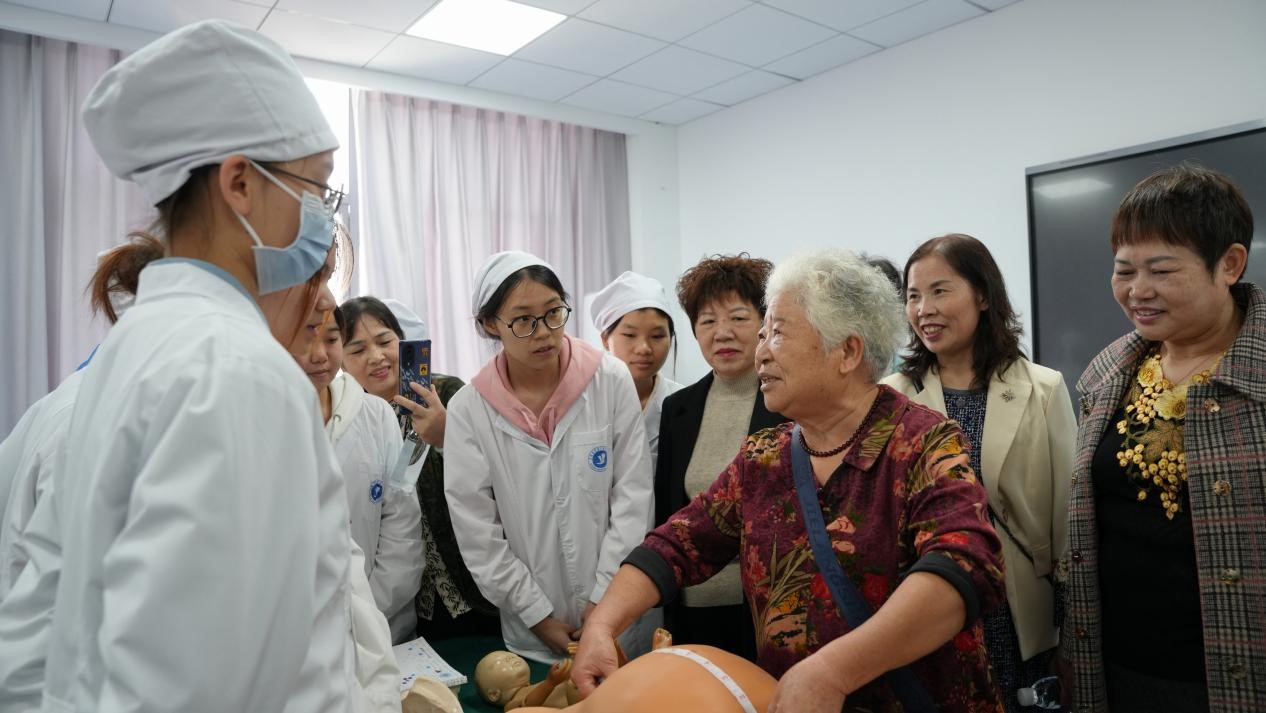 回到熟悉的课堂,退休20年的陈香莲老师不由走上了讲台,一边利用辅助教具比画着,一边跟学生讲述如何通过四步触诊法判断胎儿的大小和羊水量。“在孕妇做检查时,一定要面带微笑,动作轻柔,就像对待你们自己的姐姐一样……”陈老师细心嘱咐道。相差整整40届的学姐和学妹,紧紧围在陈老师两边,聆听谆谆教诲。