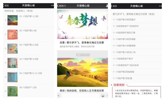 在青春火热的五月,我们迎来了大学生自己的节日——“5▪25大学生心理健康日”。在节日到来之际,益阳医专护理系举办了一系列心理健康教育宣传活动,如心理测试、主题班会、美文撰写、手绘月报、校园情景剧比赛等。通过微信公众号“天使晴心阁”推送参赛同学的优秀美文、月报、情景剧表演视频,方便大家及时广泛的参与,并为自己喜欢的作品或剧目投上一票。