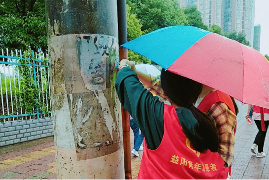 在秀峰公园,志愿者们一边开展“爱绿护绿”文明宣教活动,一边积极清洁公园环境卫生。还有一部分志愿者在校园内开展垃圾广告清除行动,彻底清理校园牛皮癣。
