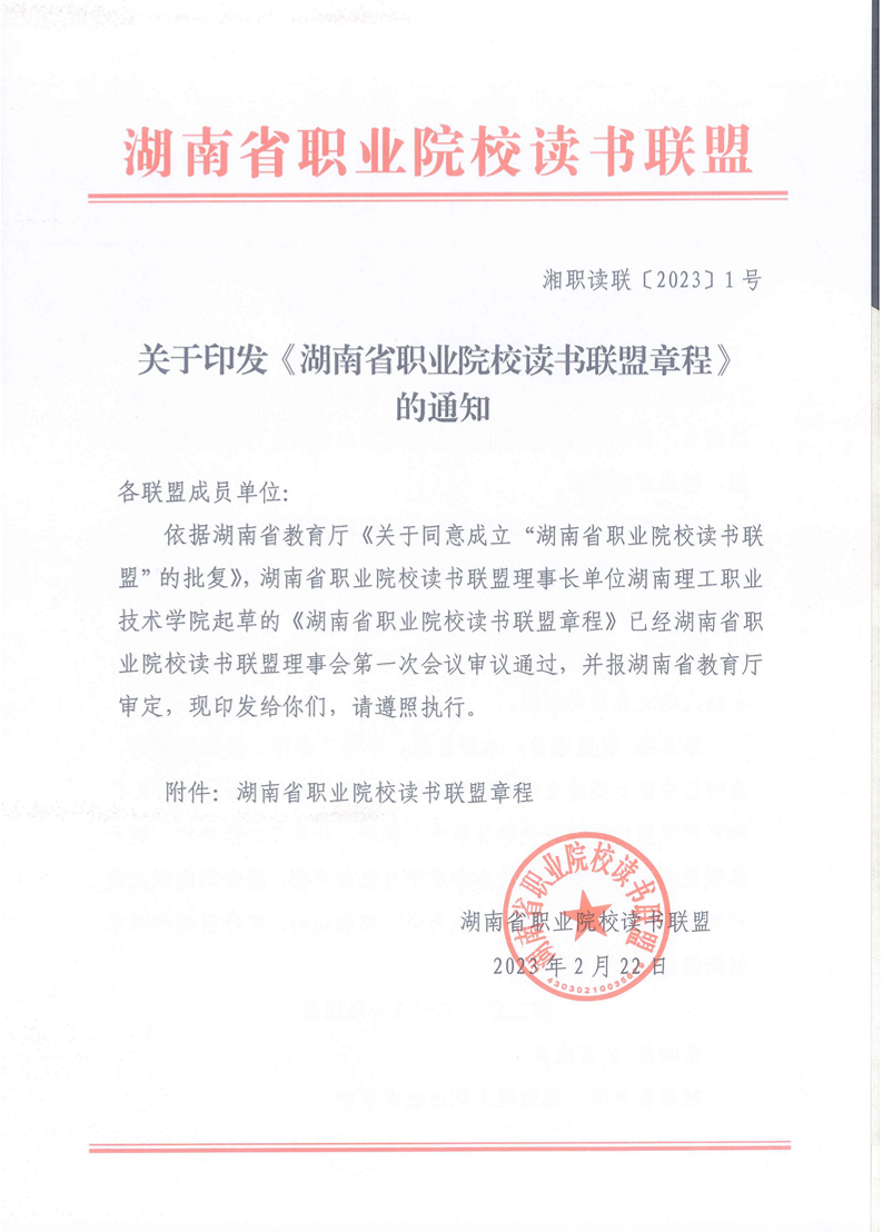 【政策文件】湘职读联〔2023〕1号 关于印发《湖南省职业院校读书联盟章程》的通知