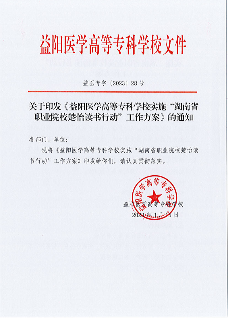 【政策文件】益医专字〔2023〕28号益阳医专实施“湖南省职业院校楚怡读书行动”工作方案