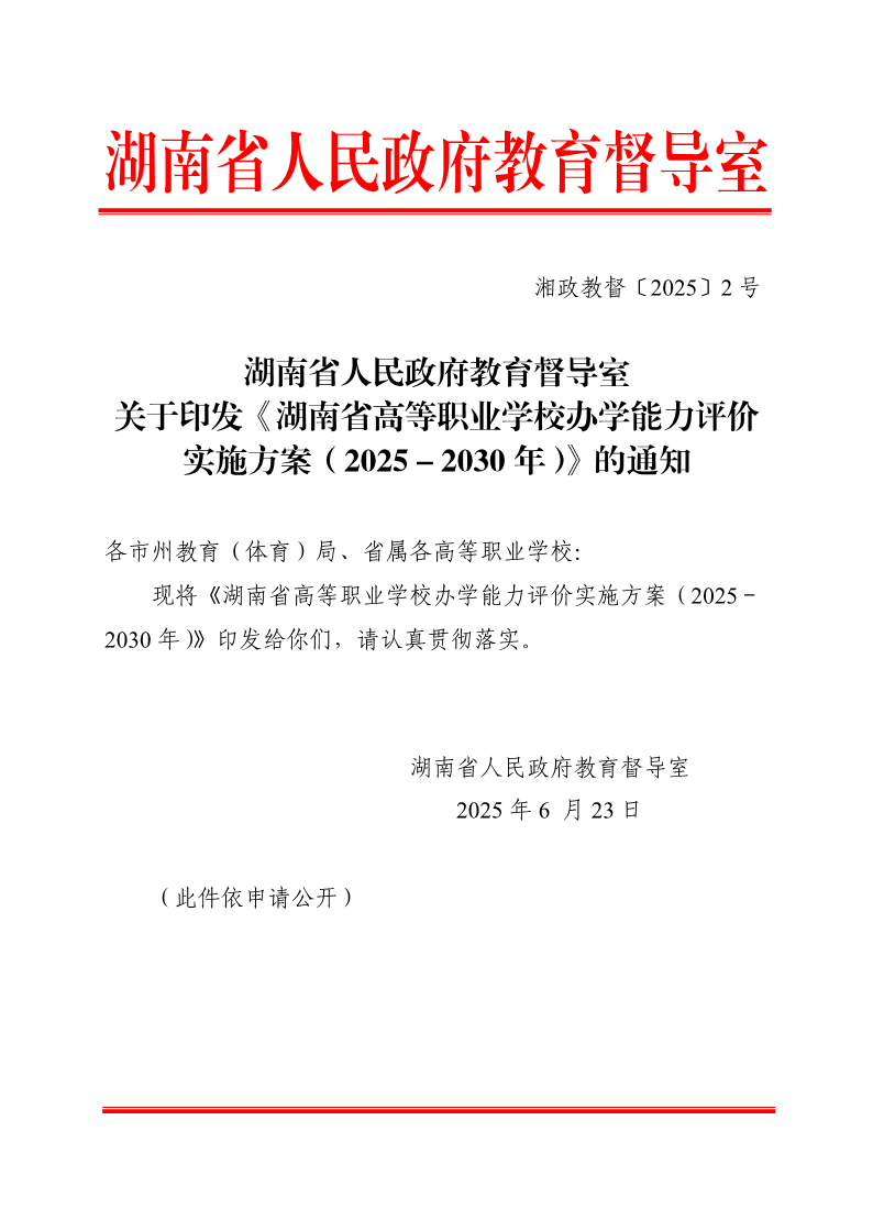 湖南省人民政府教育督导室关于印发《湖南省高等职业学校办学能力评价实施方案(2025-2030年)》的通知 来源: 发布时间:2025-12-10 11:28:19 浏览次数: 次 【字体:小 大】 湖南省人民政府教育督导室关于印发《湖南省高等职业学校办学能力评价实施方案(2025-2030年)》的通知(7).pdf 终审:质量评价中心 分享到: 【打印正文】