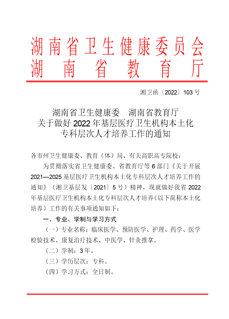 湖南省卫生健康委 湖南省教育厅关于做好2022年基层医疗卫生机构本土化专科层次人才培养工作的通知 来源: 发布时间:2022-05-28 10:11:24 浏览次数: 次 【字体:小 大】 终审:招生网 分享到: 【打印正文】